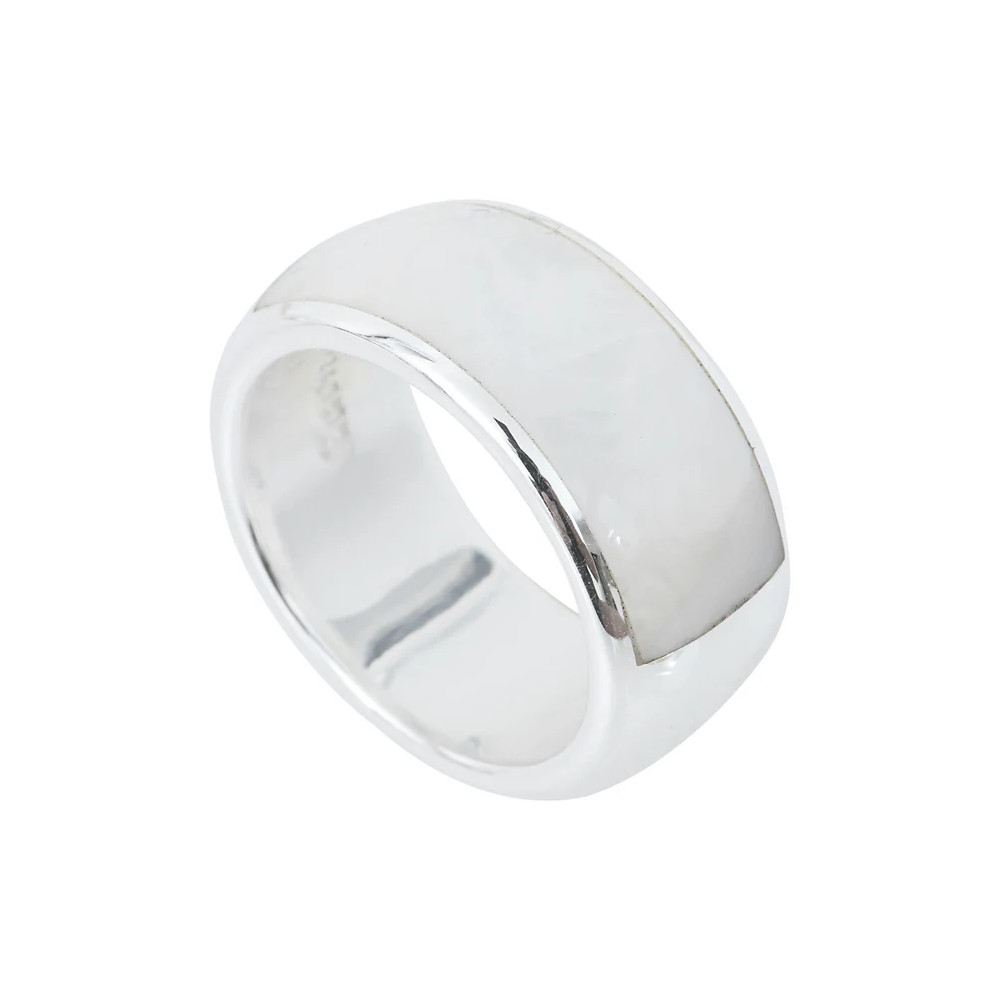 Bague "Clio BLue" ornée de quatre cabochons de nacre blanche, qui apportent une brillance subtile et des reflets irisés. Les nuances délicates de la nacre, allant du beige clair au blanc captent la lumière.